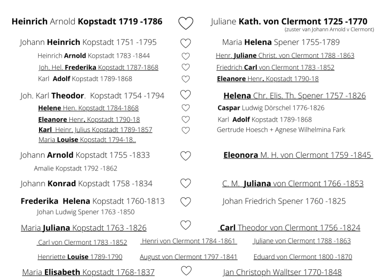 Op het overzicht hieronder zijn alle Von Clermonts en Kopstadts die in Vaals gewoond hebben onderstreept. Door de vele onderlinge huwelijken staan er een aantal kleinkinderen dubbel vermeld.